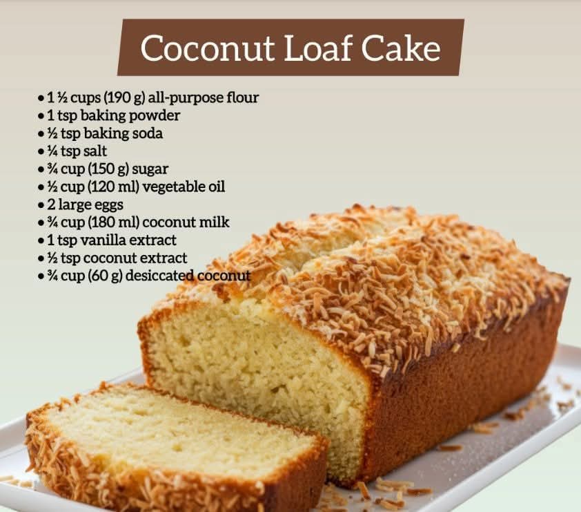 Ingredients: • 1 ½ cups (190 g) all-purpose flour • 1 tsp baking powder • ½ tsp baking soda • ¼ tsp salt • ¾ cup (150 g) sugar • ½ cup (120 ml) vegetable oil or melted butter • 2 large eggs • ¾ cup (180 ml) coconut milk (or regular milk) • 1 tsp vanilla extract • ½ tsp coconut extract (optional for stronger flavor) • ¾ cup (60 g) desiccated coconut